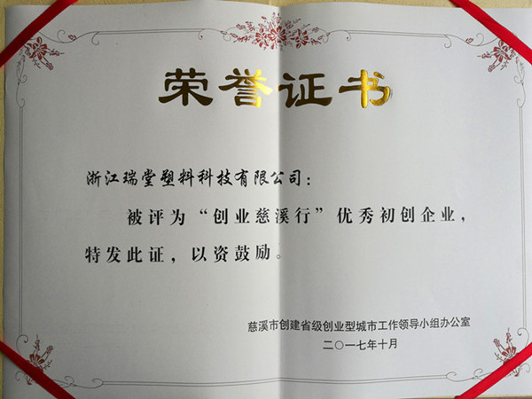 2017年10月,浙江瑞堂塑料科技有限公司被慈溪市創(chuàng)建省級創(chuàng)業(yè)型城市工作領導小組辦公室評選為“創(chuàng)業(yè)慈溪行
